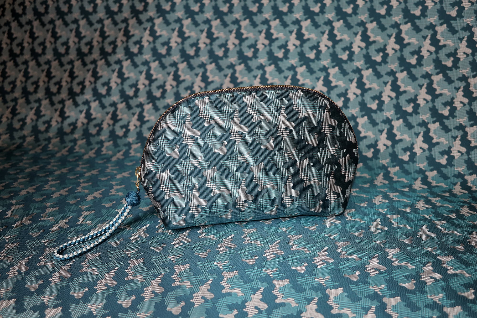 このポーチは、西陣織の最高級シルクを使用しており、軽量かつ上品な風合いが特徴です。また、引手には京組紐を使用し、ポーチを開け閉めしやすくしています。さらに、迷彩のグレンチェック柄がお洒落で、他と差を付けたい方にもおススメ!